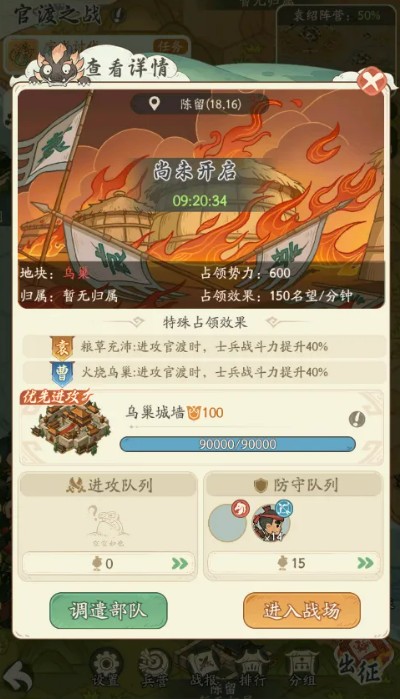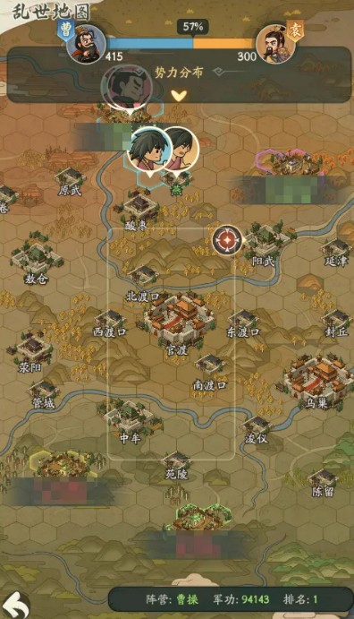 地图上有几个特别重要的位置,族长们要留意。官渡是核心目标,周围连着四个渡口,渡口之间有栈道相连。想打官渡,可以先拿下渡口,再从渡口直接进攻。渡口也可以互相攻打,用来切断对方的通道。乌巢这个地方也很重要,占了乌巢之后,攻打官渡会有额外的加成,打起来会顺很多。每天结算的时候,看双方的势力值,势力值一样的话,谁占着官渡谁就算赢。赢的那一方,当天所有联盟的军功排名都会有额外加成。