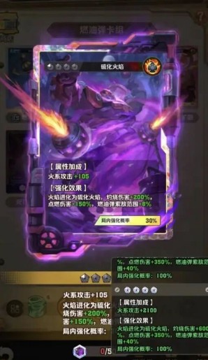 其核心强化效果围绕火焰体系展开:将火焰进化为硫化火焰,灼烧伤害提升200%,点燃伤害提升150%,同时燃油弹索敌范围增加8%,局内强化概率30%。